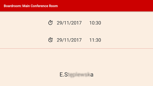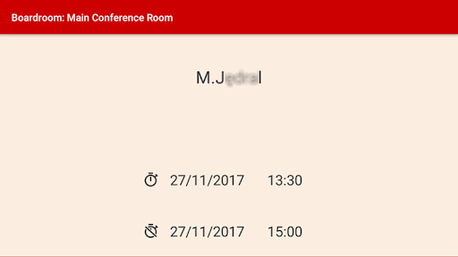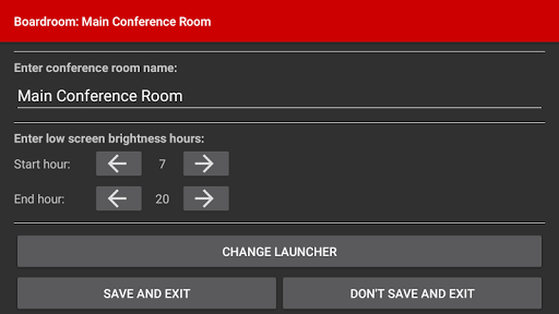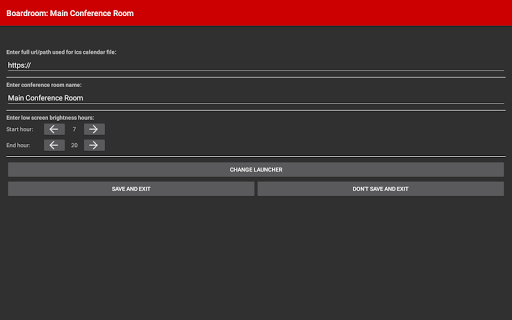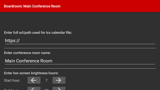 Show room meeting agenda at door tablet for one month forward. iCalendar file format is accepted. Application works in its own kiosk mode as launcher. You can change screen low brightness hours to save energy and tablet's screen. Hidden button to admin panel is at left, bottom corner. Code to admin panel: 0000.