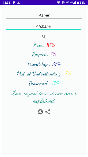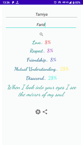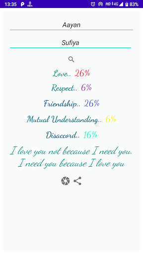 Together with the results of Love, Respect, Friendship,Mutual Understanding, Disaccord and you will see as final result in form of Quote which show your relationship status