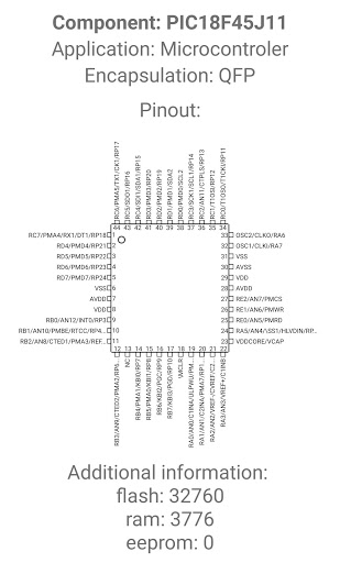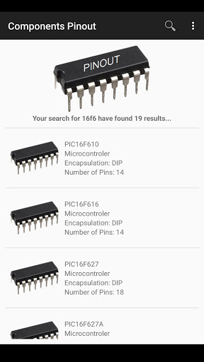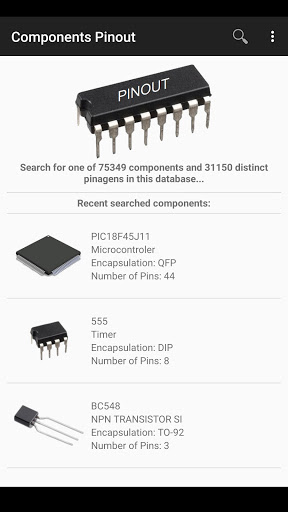 This application provides a offline database with more than 70000 electronic component pinouts. Chips, Transistors, Diodes, Triacs, Microprocessors and a lot more.