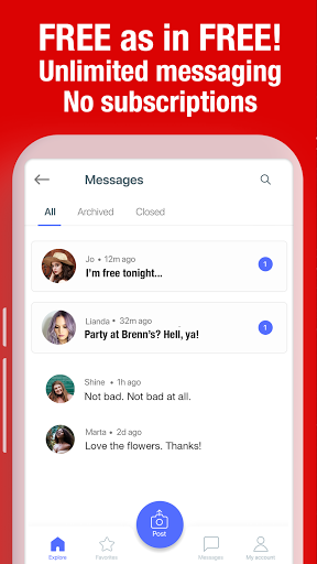 After creating a profile, you will get in touch with thousands of other users. All the matches are free, all communications are free, followers, likes - all free. It is simple, discreet and just amazing!