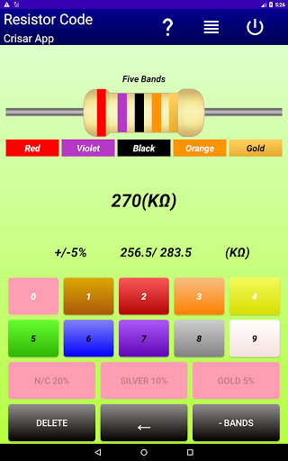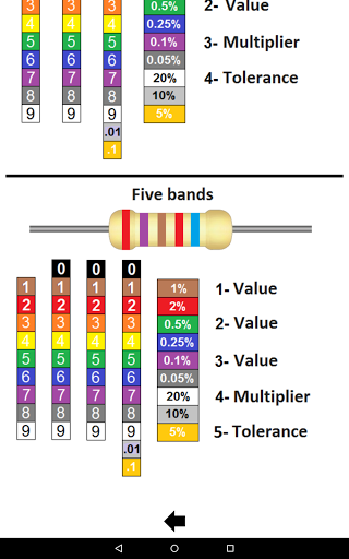 Easily calculate the resistances of three, four and five bands, just select the colors of the bands in sequence, and selecting the last color of the band will show the resistance value, as well as the minimum and maximum tolerance values . The minimum tolerance range is .05% with the brown band, the maximum value is 20% when there is no band color.