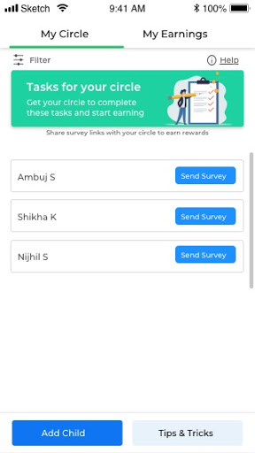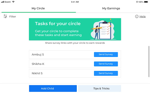 - The parent can add as many members he wants and get them to fill the survey. He will be rewarded when he adds a new member to the Circle and also when the members complete surveys*