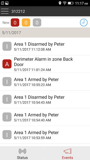 • Look back at activities over time in the events history. Know who armed or disarmed the system or which zone was violated.