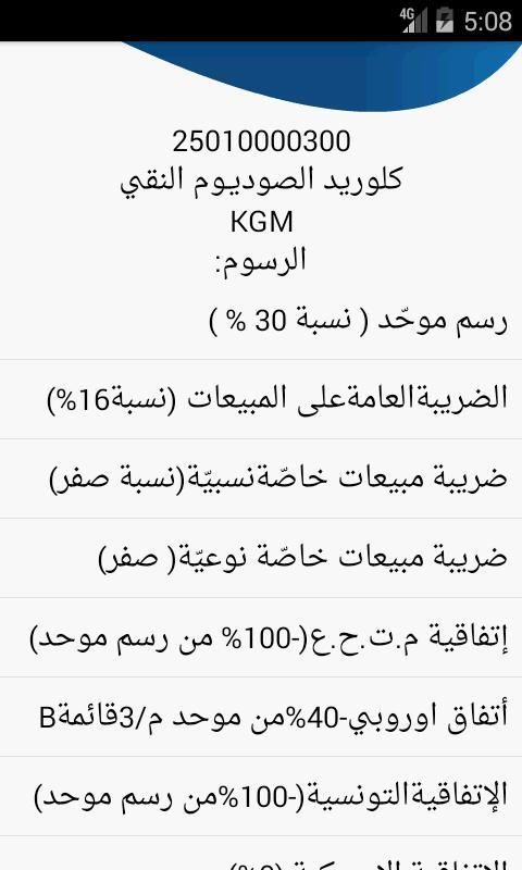 - يمكن استعراض تفاصيل بند التعريفة التي تحتوي على المعلومات التالية (رقم البند مكون من 11 خانة ، وصف البند ، وحدة الاستيفاء ، قيمة الرسوم ، الاتفاقيات التي يخضع لها البند)