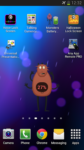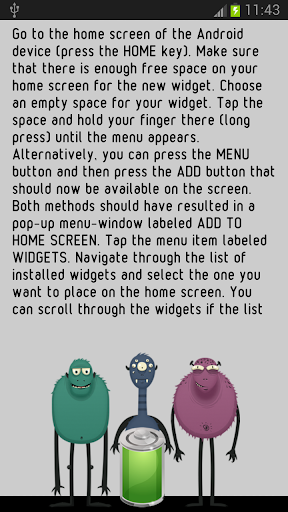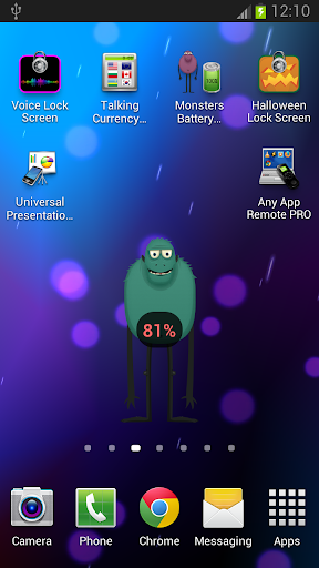 Super fun battery widget that includes ten monsters for your Android home screen! This 2x2 sized battery widget will display the battery level of your device in percents. Different battery level will provide different fun monster image. Download now for FREE!