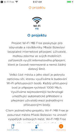 Projek Wi-Fi MB Percuma menyediakan sambungan internet percuma untuk penduduk dan pengunjung Mladá Boleslav. Pengguna dapat menggunakan sambungan internet secara percuma pada peranti mudah alih mereka, yang tidak terhad dalam waktu dan tidak mempunyai had data. Sebilangan besar kota dan sekitarnya diliputi oleh rangkaian optik, yang kami gunakan untuk membangun titik akses Wi-Fi. Setiap titik akses disambungkan pada 1000 Mbps. Kami menggunakan teknologi canggih yang membolehkan masuk dan pertukaran pengguna secara automatik antara titik akses individu. Matlamat projek Wi-Fi MB Percuma yang unik adalah untuk memindahkan bandar Mladá Boleslav ke tahap bandar-bandar dunia maju. Wi-Fi MB Percuma memberi anda akses internet yang selamat.