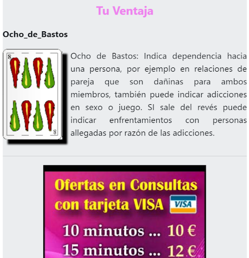 También a la tirada si o no preguntas , que suele ser una lectura de cartas gratis muy utilizada por videntes, sin olvidar cartomancia del amor que se puede realizar con la tirada de cartas españolas.