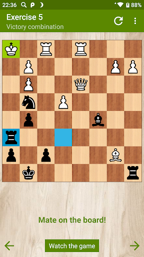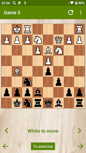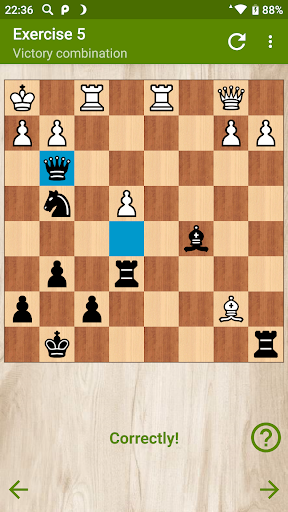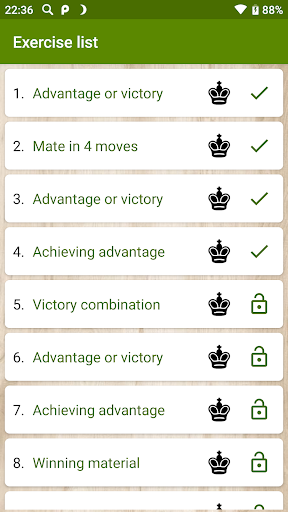 The free version contains 18 interesting puzzles with victory combinations, achieving advantage and checkmating in several moves. After solving each of them, the opportunity opens up to watch the whole chess game, from which the position of the exercise was obtained.
