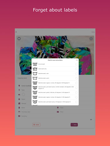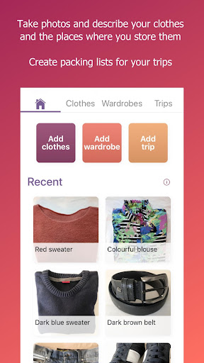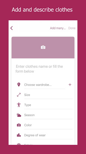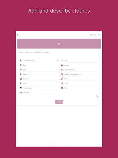 - Describe your clothes with: type, size, season, color, degree of wear, fabric, brand, store name, town, purchase date, price, currency (each of these is of course optional :) ),