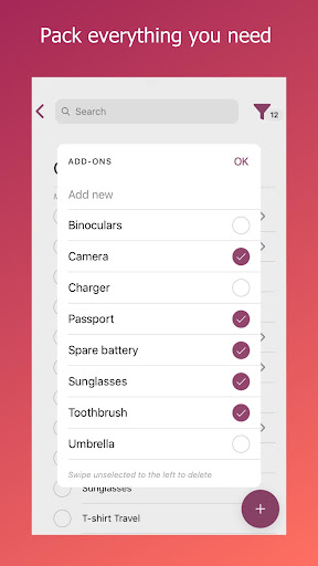 - Next to clothes you can plan and pack (so called) add-ons - items you haven’t saved in your clothes but are worthy to take, like toothbrush or passport.