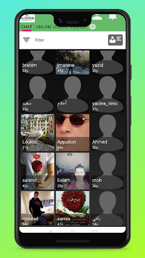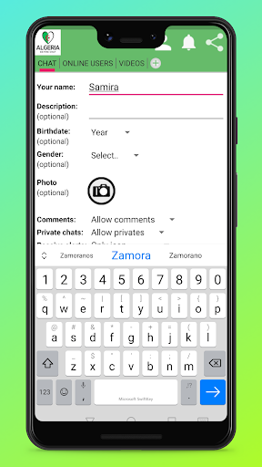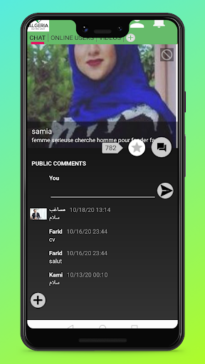 The goal of this free application is to help Singles find love and friends in Algeria. Our members all from all over Algeria: Algiers, Oran, Annaba, Tlemcen, Tizi Ouzou. The Sign-up process is very simple. You will have just to enter your name, gender, date of birth, hobbies and write an optional description if you want to. It is recommended to write a description so that other members know what you are looking for. A public chat is available on the application. The search engine lets you search partners based on your criteria (gender, distance and age). Contact the members who looked into your profile and you can get to know each other. Members can easily share pictures or videos and find out who is available for starting a private chat. Members will receive notifications from users (comments, likes, dislikes). Users can comment on a post and reply to a comment. You can decide who can message you or post on your profile. Download the application and become a member of our Dating community in Algeria.