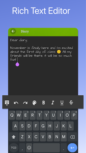 Use this Diary to journal with a Rich Text Editor. It can be customized with beautiful themes and backgrounds and fonts.