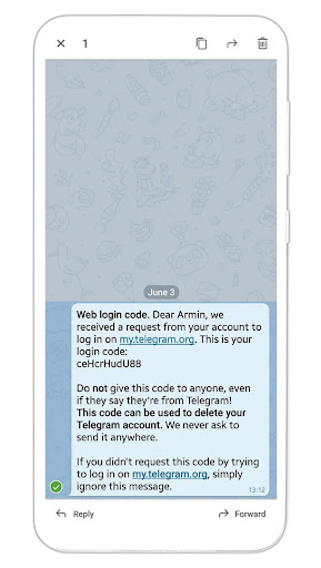 ❷ A message containing the delete account code will be sent to your account on telegram.