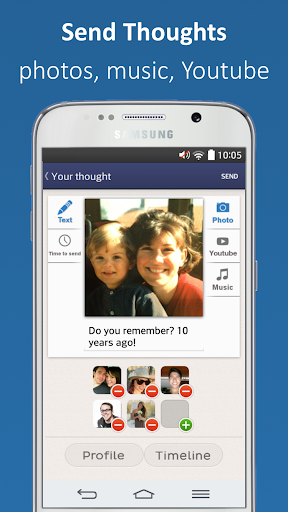 Post, share and comment using text messages, pictures, YouTube video and music. The integrated search function enables you to find every thought you have sent or received.