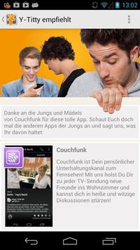 Die Jungs von Couchfunk helfen Dir gerne bei allen Wünschen und technischen Fragen zur App. Schreib ihnen deine Nachricht am besten Mail, Facebook, Twitter oder in den Support Bereich für die Y-Titty-App.