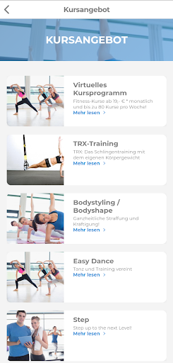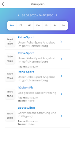 Den aktuellen Kursplan kannst du jederzeit über die App abrufen, somit bist du immer informiert, wann die Kurs beginnen. Du wirst nie wieder deinen Lieblingskurs verpassen.