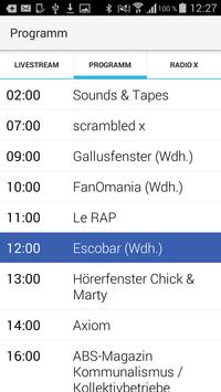 Das radio x Programm umfasst u.a. Literatur-, Musik-, Kino-, Schüler- und Veranstaltungsmagazine, Sendungen mit Schwerpunkt auf queeren Themen, der Frankfurter Musikszene oder Stadtteilkultur, Hörspiele, Klangexperimente, medienpädagogische Sendungen von und für Kinder, fremdsprachige Sendungen, sowie eine tägliche DJ-Nacht.