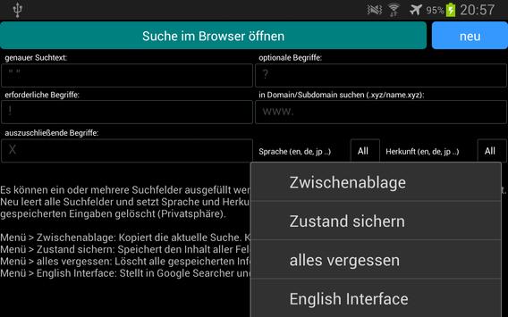 The Google Searcher does not need any special permissions. It builds the search string and opens it on button click in the installed browser. Thus it doesn't even need Internet access.