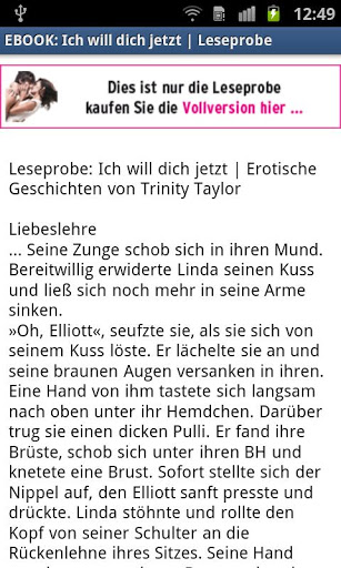 LESEPROBE zum der folgenden erotischen BuchApp. Die Vollversion hier bei google Play.Ich will dich jetzt Erotische Geschichten von Trinity Taylor.Erotisches ebook eBook mit 224 Taschenbuch Seiten.Weitere erotische EBooks, Hrbcher, Lese und Hrproben als App hier im store Das sagt die Presse:bild.de:Erotischer Buchtipp: Es geht um unerfllte Wnsche, um unterdrcktes Verlangen, um erotische Begierde Frauen auf der Suche nach Glck, nach Befreiung aus ihrem selbst gebauten prden SexKfig. Fr den kleinen SexAppetit zwischendurch der ideale LustStiller Aufregend, hei ... Beschreibung:Trinity Taylor erzhlt auchin diesem fnften Buch vonihren intimsten ErotikTrumen Mit dem besten Freund fr das Datemit einem Fremden Sex ben,sich einem Modedesigner auf demCatwalk im sexy Outfit prsentieren,den Unbekannten im Tempel der Lustunter einem Wasserfall verwhnen, oder sich von einem Klavierschlerverfhren lassen Liebe, Verlangen und Leidenschaftfgen sich in sechs perfekt sexyerotische Geschichten. Leseprobe:Liebeslehre... Linda drckte den Klingelknopf. Was, wenn er nicht da wre? Was, wenn er sie auslachen wrde? Was, wenn er ihr die Tr wieder vor der Nase zuschlug?Die Wohnungstr ffnete sich. Howards Kopf erschien. Erstaunt blickte er sie an. LindaHallo, Howard. Stre ich dich?Nein, komm rein.Sie bedankte sich leise und ging an ihm vorbei.Noch whrend er die Tr schloss, fragte er: Ist was passiert?Linda zog die dicke Jacke, den Schal und die Stiefel aus. Nein, nicht direkt. Ich brauche deine Hilfe. Sie ging ins Wohnzimmer, setzte sich auf die Couch. Ihre Hnde schob sie unter ihre Oberschenkel.Howard war ihr gefolgt. Aha. Mchtest du einen Kaffee?Sie nickte. Gern.Er verschwand in der Kche und hantierte mit Bechern herum. Der Kaffeeautomat brhte ruck zuck zwei Kaffees. Als Howard ihr den Becher reichte, war schon Milch drin.Danke.Also? Howard lie sich in einen Sessel sinken, fhrte seinen Becher zum Mund, nahm einen vorsichtigen Schluck und fragte: Wobei soll ich dir helfen?Schnell fhrte auch Linda ihren Kaffee zu den Lippen und nahm einen Schluck. Es ist etwas prekr, sagte sie langsam.Soll ich etwa Elliott fr dich umbringen? Er lachte ber seinen eigenen Witz.Nein, es hat nur indirekt mit ihm zu tun. Eher mit dir und mir.Howard wurde hellhrig. Mir mir und dir? Was meinst du?Schlaf mit mirHoward klappte der Mund auf. Er war sprachlos. WAS?, stie er schlielich hervor.Ich wei, es ist eine sehr groe Bitte. Aber ich mchte einfach mit dem Wissen, was beim Sex passiert, zu Elliott zurckkehren. Wenn wir dann miteinander schlafen, dann wei ich wenigstens, worauf es ankommt.Und ich bin das Versuchskaninchen?Nein, du bist mein Lehrer.Howard stellte seinen Kaffeebecher weg und schttelte vehement den Kopf. Das kommt berhaupt nicht in FrageBitte.NEIN, Linda Er sprang auf. Eine Weile blickte er sie an, als htte sie den Verstand verloren. Dann lief er wie ein Panther im Zimmer auf und ab.Es soll ja auch keine groe Sache werden, versuchte Linda es. Es soll nur ein... eine Art Erfahrung oder Gebrauchsanweisung werden.Gebrauchsanweisung? Er starrte sie an.Linda senkte den Kopf. Tut mir leid. Ist wohl doch ein bisschen viel verlangt, oder?Ja, wei Gott, das ist es Er schttelte den Kopf, dann sagte er etwas ruhiger. Linda, man kann doch nur mit jemandem Sex haben, den man auch liebt. Ansonsten ist es Prostitution.Aber ich liebe dich doch.Stille.Lindas Herz begann wild zu schlagen. Was hatte sie da gesagt?Howard blickte sie wie erstarrt an.Ich meine..., versuchte Linda die Sache ins rechte Licht zu rcken. Wir ... sind ... schon so lange befreundet und kennen uns so gut .... Natrlich mag ich dich, und ich hab dich lieb als besten Freund. Verstehst du, was ich meine?Langsam nickte er. Ja, verstehe.