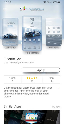Get the beautiful Electric Car theme for your smartphone! Transform the look of your phone with this stylish, custom-designed homescreen and its electric car motives. It has: