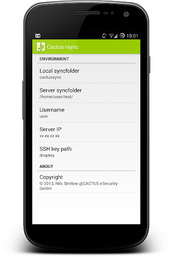 Zum Start muss ein Server mit rsync und ssh eingerichtet werden und ein Dropbear SSH Key erstellt werden. Näheres ist diesem HowTo zu entnehmen: http://howto.cactus.de/index.php/Android_rsync_App#Einrichten_der_Cactus_Rsync_App