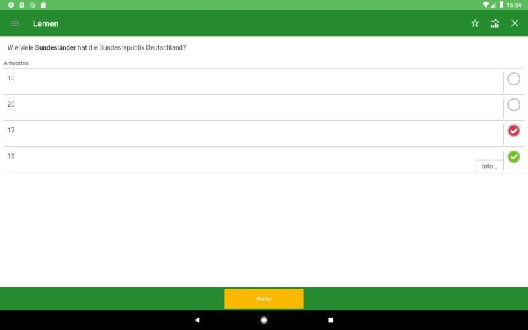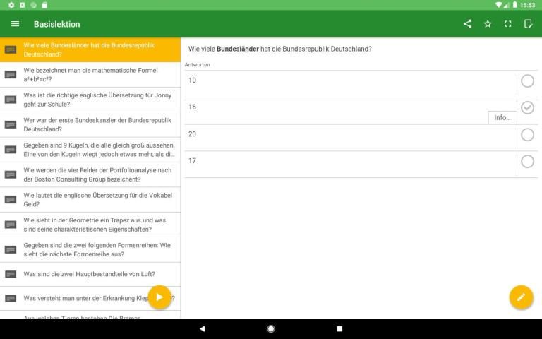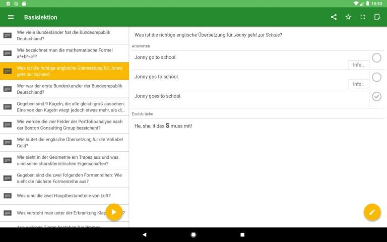 By saving your learning status and the offline feature of the application, your learning content is always available to you and adapted to your learning progress. You'll be helped by an algorithm that takes your learning needs into account so you can learn the content that is not that easy for you. Among other things, you can prepare yourself for an upcoming exam (exam mode) or specifically train your long-term memory (long-term memory mode) as well as your short-term memory (power mode).