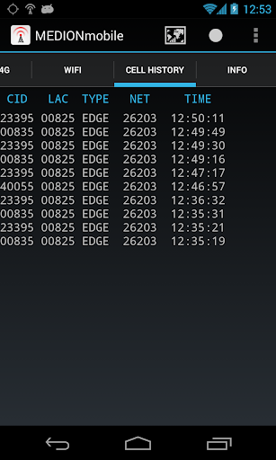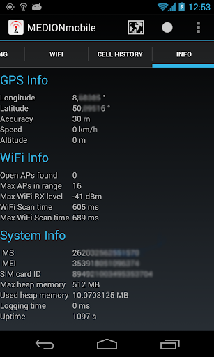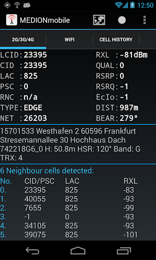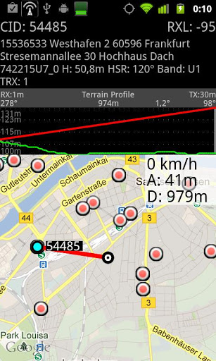 You can log GSM or UMTS RX levels into a kml file for Google Earth or a csv file. There are 5 color groups for different levels. These levels can be defined by the user in the settings menue. This file is saved into the gmon folder on the sdcard or external memory. When the log is running, the G-MoN Notification Icon changes color to red. 2G/3G logging does not work when the screen is off!