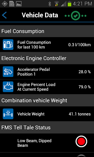 Driver can view the Vehicle operational status with data from the vehicle which is unique to the DTCO 2.2(VDO) : Fuel Consumption, Electronic Engine Controller, Combination Vehicle Weight, FMS Tell Tale Status: Cooling Air Conditioning, High Beam, Main Beam, Low Beam, Dipped Beam, Turn Signals & Hazard Warning & many more