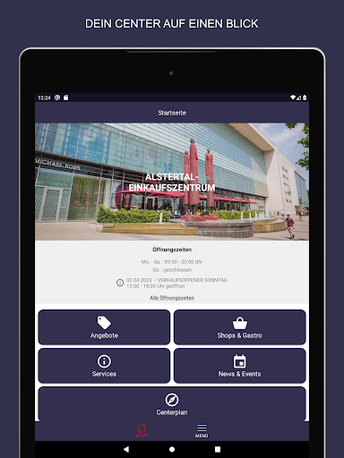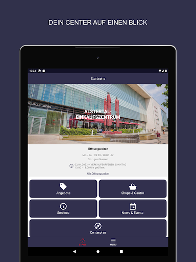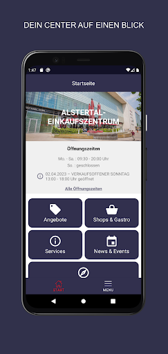 • tulad ng sa A & quot; digital shop window & quot;Tingnan ang mga naka-istilong mga uso, mga highlight ng fashion at alok mula sa Alstertal shopping center-kung saan at kahit kailan mo nais! [Sa pamamagitan ng pag-activate ng pag-andar ng push, palagi kang napapanahon.Kung hindi ito sapat, maaari mong i -synchronize ang mga appointment ng paparating na mga kaganapan nang direkta sa kalendaryo nito.Inaasahan namin ang iyong pagbisita sa Alstertal Shopping Center!