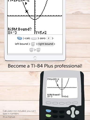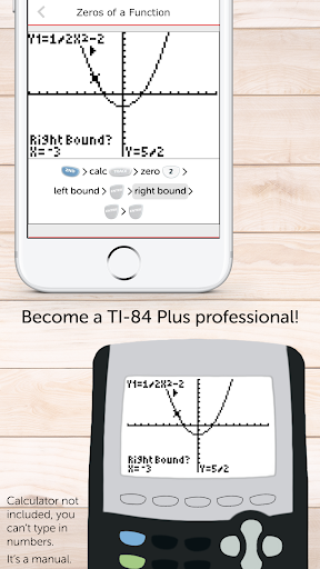 • Every topic shows a detailed instruction through screenshots of the original graphing calculator TI-84 Plus which explain how to use the calculator. You only have to swipe right to get the next screenshot which looks similar to your calculator display!