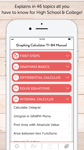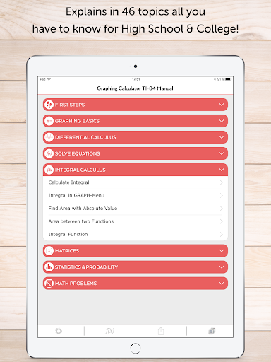 • The app shows the exact key press sequence for 46 topics. It covers the chapter:s First Steps, Graphing Basics, Differential Calculus, Solve Equations, Integral Calculus, Matrices and Statistics & Probability.
