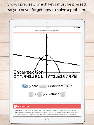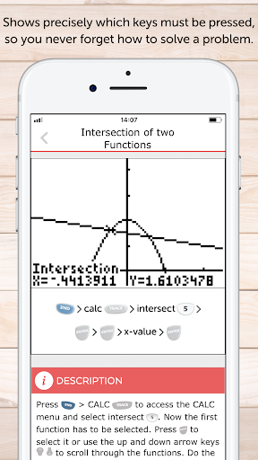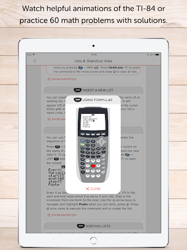 • You can swipe through screenshots of the original graphing calculator which show every step you have to do (220 screenshots in total) or watch small animations to see how it works on the TI-84!