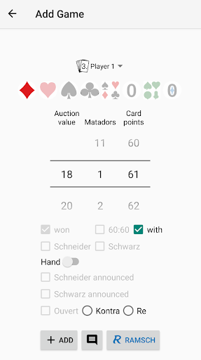 Bock manually or in case of 60:60 scoring, after lost/won Grand Hand, lost Kontra and/or a game with ≥ 100