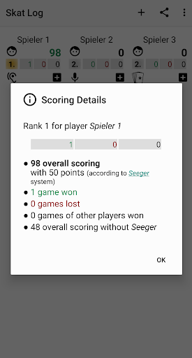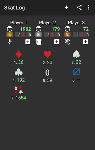 Shows ranking and role for each player (deal, announce, listen, re-announce)