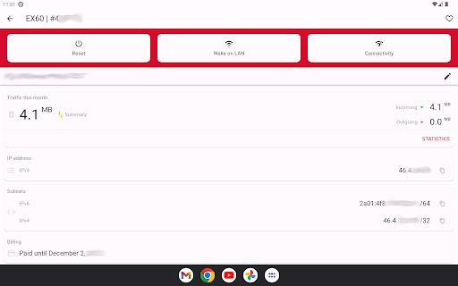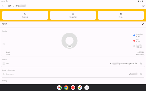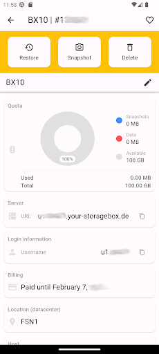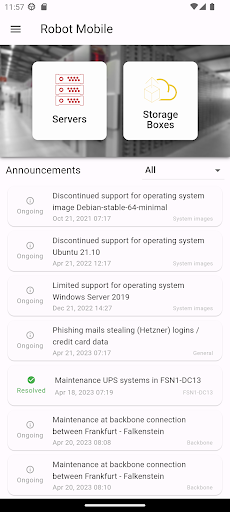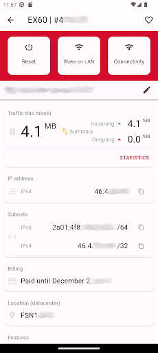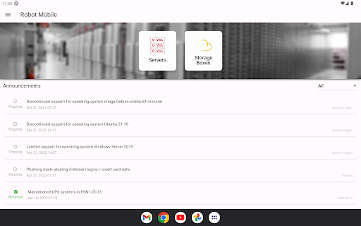 The mobile application from Hetzner Online enables you to administer the most crucial functions of your Root-Server or Storage-Boxes. Robot Mobile provides functions like for example server resets, Wake On Lan, configuration of failover IPs, setup of traffic warnings, monitoring of traffic statistics or creating, recovering and deleting of Storage-Box snapshots.