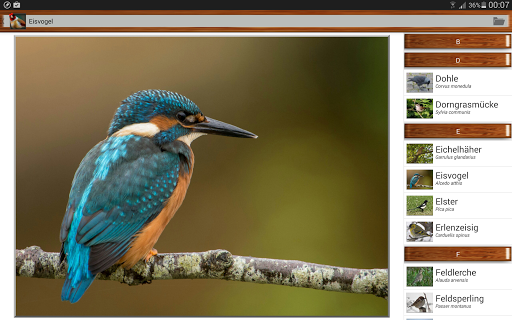 With *Hear* you can quickly select a bird and listen to the bird song. Under *Wiki* you get the appropriate Wikipedia entry. In the forest and no reception? No problem, under *Info* there is the most important information offline. The *Gallery* shows birds full screen and plays the bird calls. By wiping you can navigate.