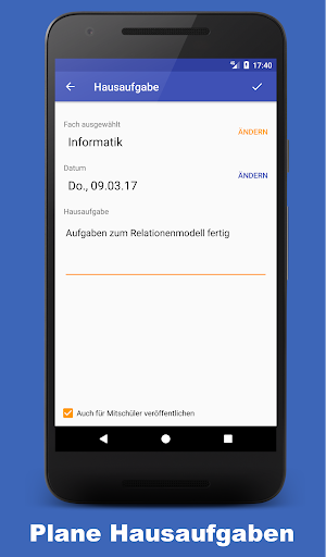 Die eingebauten Kommunikationstools helfen dir unter anderem, Hausaufgaben einfach einzutragen und bequem mit Mitschülern zu teilen. Die App hilft dir dabei, immer deine persönlichen Hausaufgaben im Überblick zu behalten, so dass du sie nie wieder vergessen wirst.