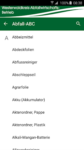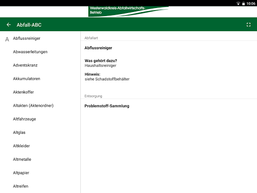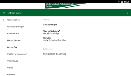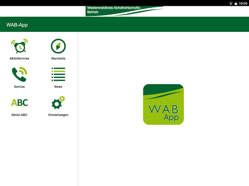 Aplikasi WAB menawarkan info limbah penting seperti lokasi wadah kaca, outlet dari tas limbah residu serta alamat pusat daur ulang atau fasilitas pembuangan dengan jam buka. Situs Seluruh hal yang dikeluarkan oleh ABC limbah yang komprehensif, Dengan beberapa ratus konsep limbah dan jalur pembuangannya masing-masing.
