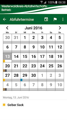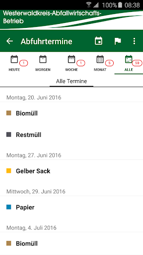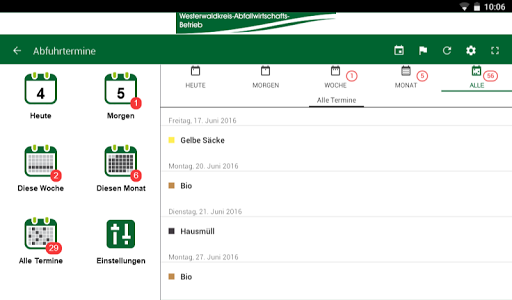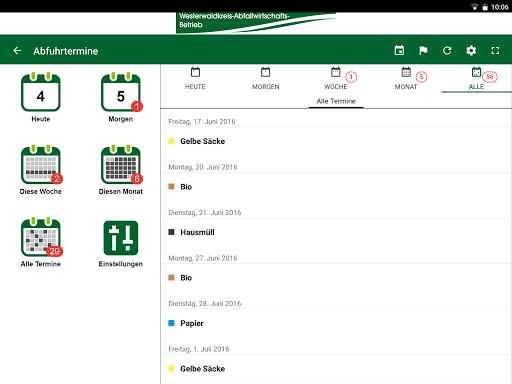 Cukup pilih tempat tinggal, pengaturan pengingat dan sudah termasuk tanggal pelepasan yang tidak terjawab untuk limbah residu, biomull, kertas bekas, karung kuning, limbah besar atau jenis yang berbeda.