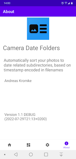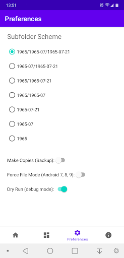 This program creates a folder tree structure and sorts the photos into these folders. As a result, no more than photos taken on one day or month shall be stored in the same directory. As a consequence it it will become trivial to copy a day or month folder from the device to the computer.
