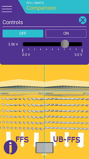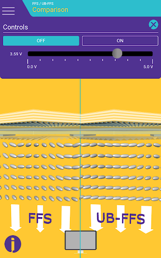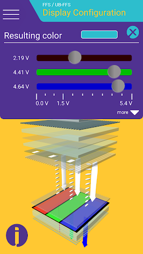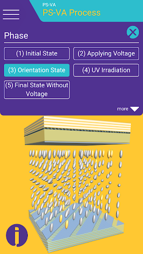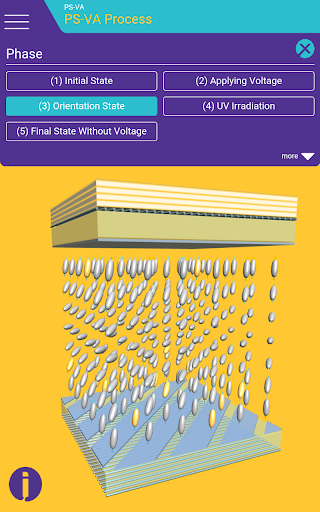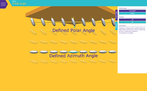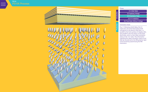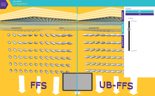 Surf through different layers and technologies and stop where you would like to learn more. Clear texts provide information on structure, pixel profile, functions, and much more. With the switching function you are in control: Define different voltages and experience how they affect the structure of the liquid crystal layer and the color effect.