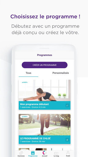 Créez votre propre programme à partir des exercices que vous aurez sélectionnés grâce aux fonctions « favori » ou bien débutez immédiatement un programme de la communauté. L'application se chargera de vous guider pour planifier et réaliser vos séances où vous voulez !