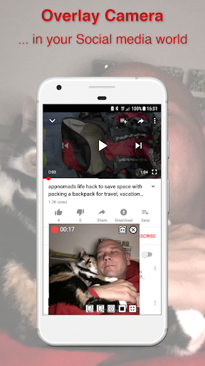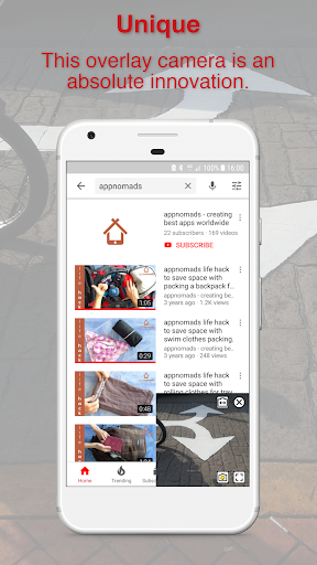 With Live Camera for Youtube you can watch your surroundings live on your mobile phone display. Avoid accidents and collisions in everyday life with this clever and simple Overlay Camera. Keep an eye on your surroundings while using almost every app. With the Live Camera Smombies and cell phone fails belong to the past. Easily move the overlay on your mobile phone display. Enlarge or minimise the Live Camera with just one click.