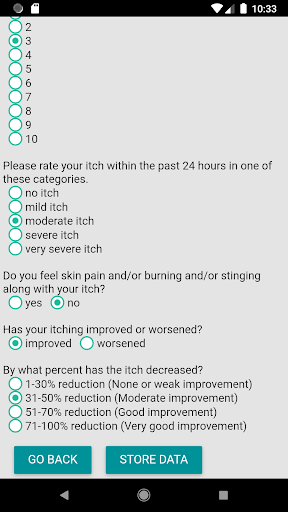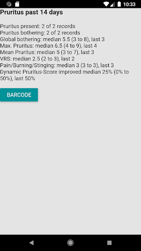 Patients with chronic itch (pruritus) can document their symptoms with this app. The questionnaire was developed by a European team of experts. If you answer these questions on a regular basis, the app can provide a summary of your symptoms for Your doctor. Your data can be transferred with a barcode.