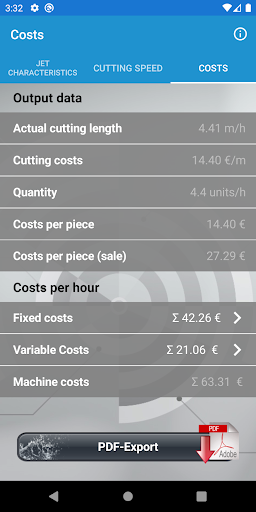 A machine-hour cost assessment can be generated in Area 3. In the input area, the material and contour-specific features, as well as the necessary fixed and variable costs are recorded. Based on the data entered, the cutting costs per meter, unit costs and the costs per machine hour are determined.