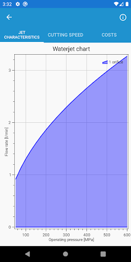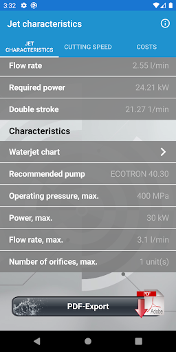 The Waterjet Calculator, like the Waterjet App from the same company, is divided into 3 basic areas.