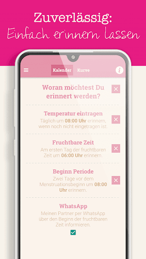 Lass Dich daran erinnern täglich Deine Temperatur einzutragen. Um die fruchtbare Zeit nicht zu verpassen, kannst Du Dich auch daran erinnern lassen. Zusätzlich hast Du die Möglichkeit, Deinen Partner zu Beginn der fruchtbaren Tage per Smartphone zu benachrichtigen.