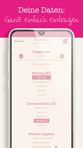 ★ Einträge jeden Tag des Zyklus möglich, z. B. Zyklusschleim, Sex, Mittelschmerz, inklusive Erinnerungsfunktion