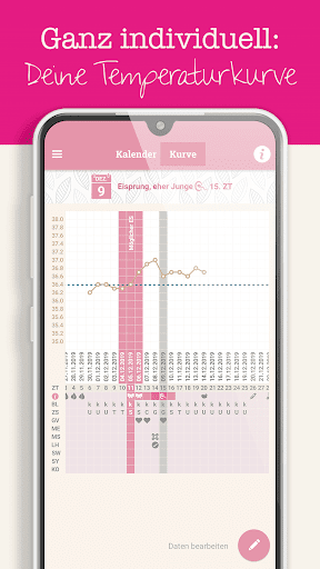 Du kannst im Zykluskalender jeden Tag Einstellungen zu Zervixschleim, Temperatur, LH-Test, Geschlechtsverkehr, Mittelschmerz und anderen Besonderheiten eintragen. Zusätzlich kannst Du täglich Notizen eingeben. Und die App lernt dazu: Die Zykluslänge errechnet sich aus dem Durchschnitt Deiner letzten drei Zyklen. Zusätzlich kannst Du jeden Zyklus individuell anpassen. Alle Deine Daten werden dabei ausschließlich auf Deinem Handy gespeichert und nicht an Dritte weitergegeben.