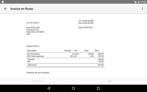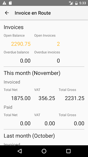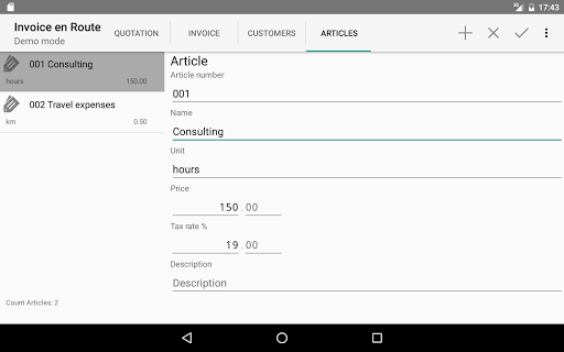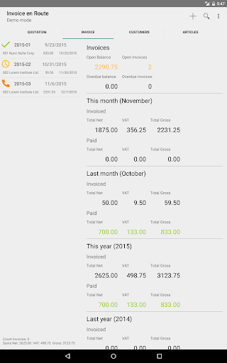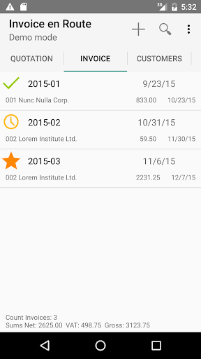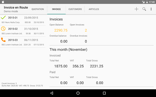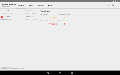 creates PDF quotations and invoices on your smartphone or tablet. You can send the PDF directly to the customer. At a glance you can see the status and latest monthly and annual totals, as well as VAT payable to the tax office.